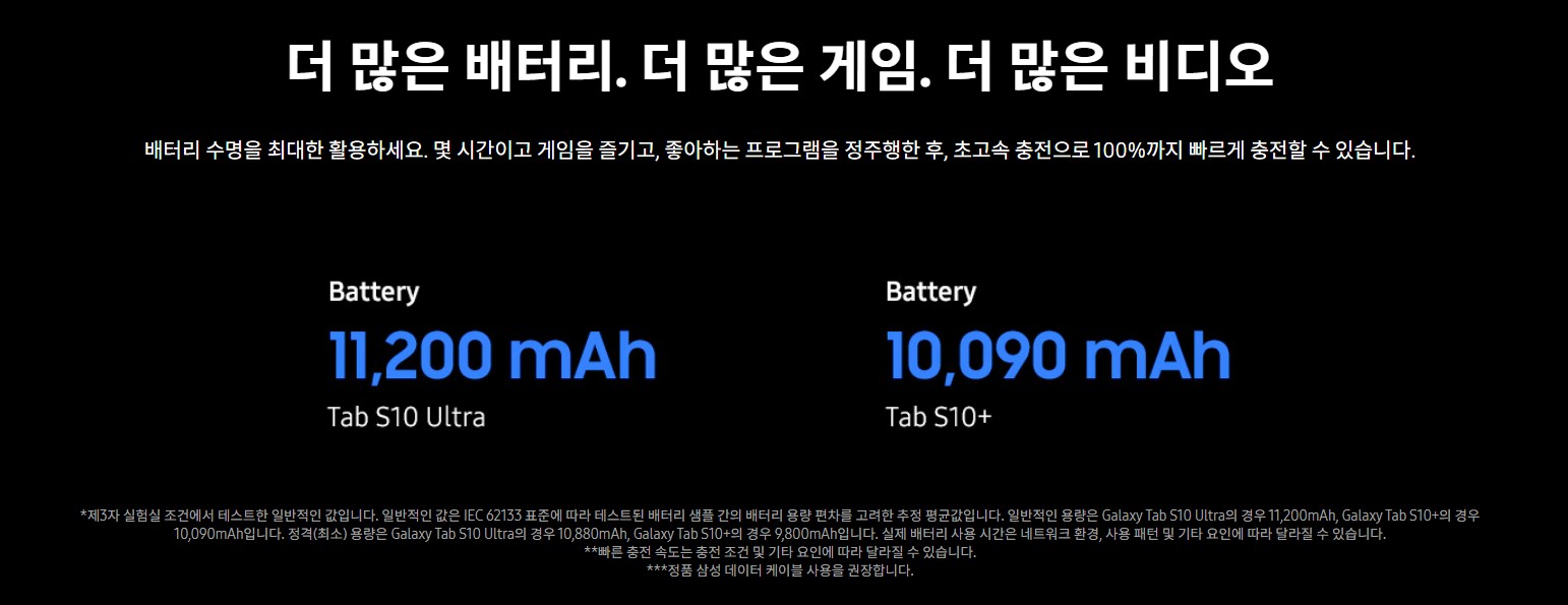 - 갤럭시 탭 S11 울트라: 11,700mAh에 가까운 역대급 배터리 덕분에 AI 기능을 오래 활용할 수 있다는 점이 가장 큰 강점입니다. (실제 테스트 시, 50% 밝기에서 넷플릭스 연속 재생 15시간, 웹 서핑 12시간 이상 가능) 이는 갤럭시 탭 S10 울트라가 안정적이었지만 배터리 지속 시간이 아쉬웠던 점을 크게 개선한 부분입니다.