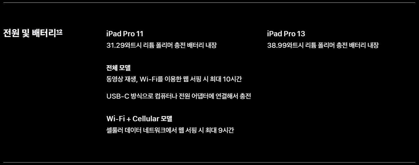 - 아이패드 프로 M4 13인치: 10,758mAh 배터리로 약 10시간 내외의 사용 시간을 제공합니다. M4 칩의 뛰어난 전력 효율 덕분에 준수한 배터리 성능을 보여줍니다.