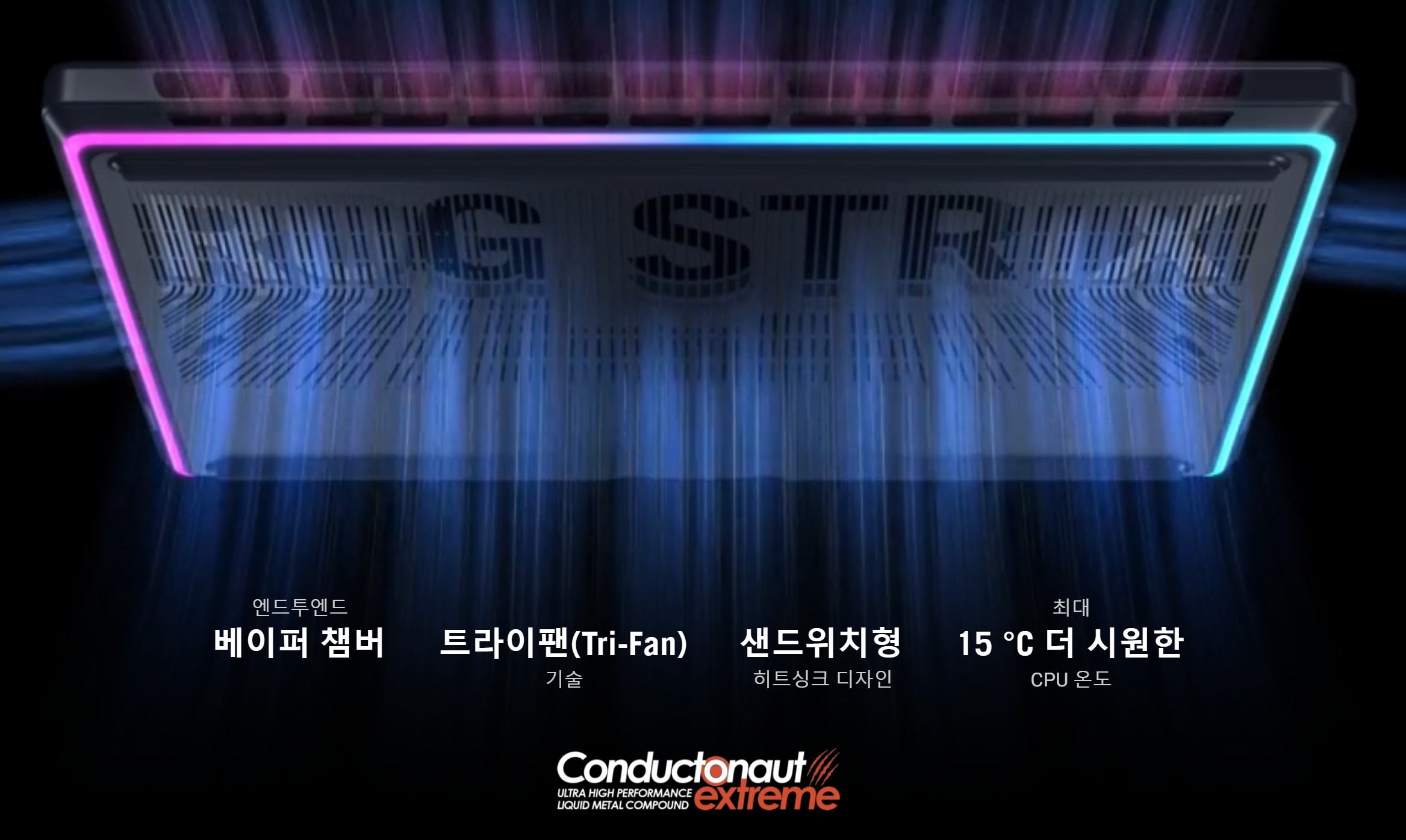 고성능 게이밍 노트북에서 발열 관리는 매우 중요한 요소입니다. 이번 ROG 스트릭스 2025 시리즈에서는 Tri-Fan 냉각 시스템과 리퀴드 메탈(액체 금속) 쿨링이 적용되었습니다.